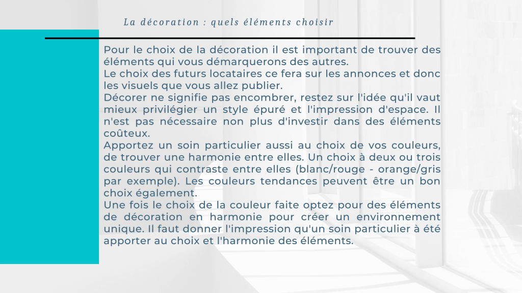 Pour le choix de la décoration il est important de trouver des éléments qui vous démarquerons des autres. Le choix des futurs locataires ce fera sur les annonces et donc les visuels que vous allez publier. Décorer ne signifie pas encombrer, restez sur l’idée qu’il vaut mieux privilégier un style épuré et l’impression d’espace. Il n’est pas nécessaire non plus d’investir dans des éléments coûteux. Apportez un soin particulier aussi au choix de vos couleurs, de trouver une harmonie entre elles. Un choix à deux ou trois couleurs qui contraste entre elles (blanc/rouge – orange/gris par exemple). Les couleurs tendances peuvent être un bon choix également. Une fois le choix de la couleur faite optez pour des éléments de décoration en harmonie pour créer un environnement unique. Il faut donner l’impression qu’un soin particulier à été apporter au choix et l’harmonie des éléments.