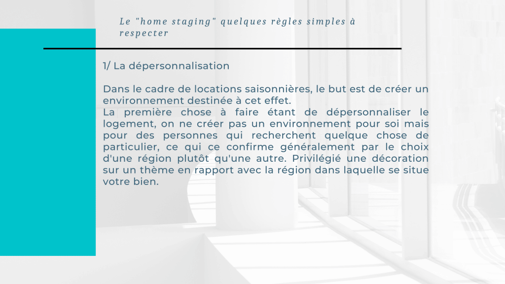 Dans cette optique le « home staging » s’avère être la solution la plus approprié, le but étant de créer un environnement agréable avec une décoration en harmonie avec l’ensemble des éléments de la pièce et avec éventuellement un thème sur la région dans lequel le bien est situé.