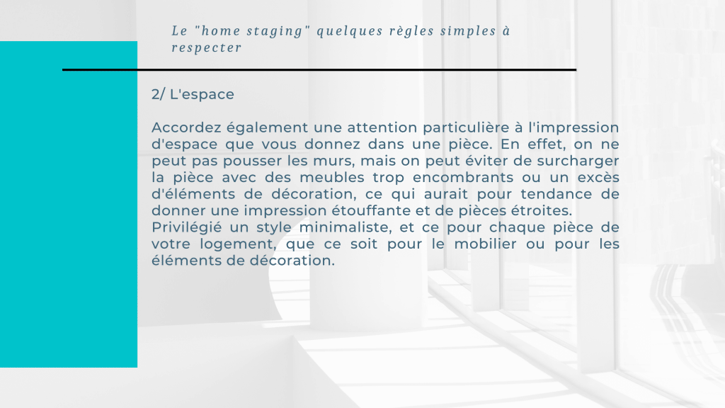 Pour cela il n’est pas nécessaire d’investir dans du mobilier ou des éléments de décoration onéreux, mais plutôt de respecter quelques règles simples afin de valoriser au mieux votre bien.