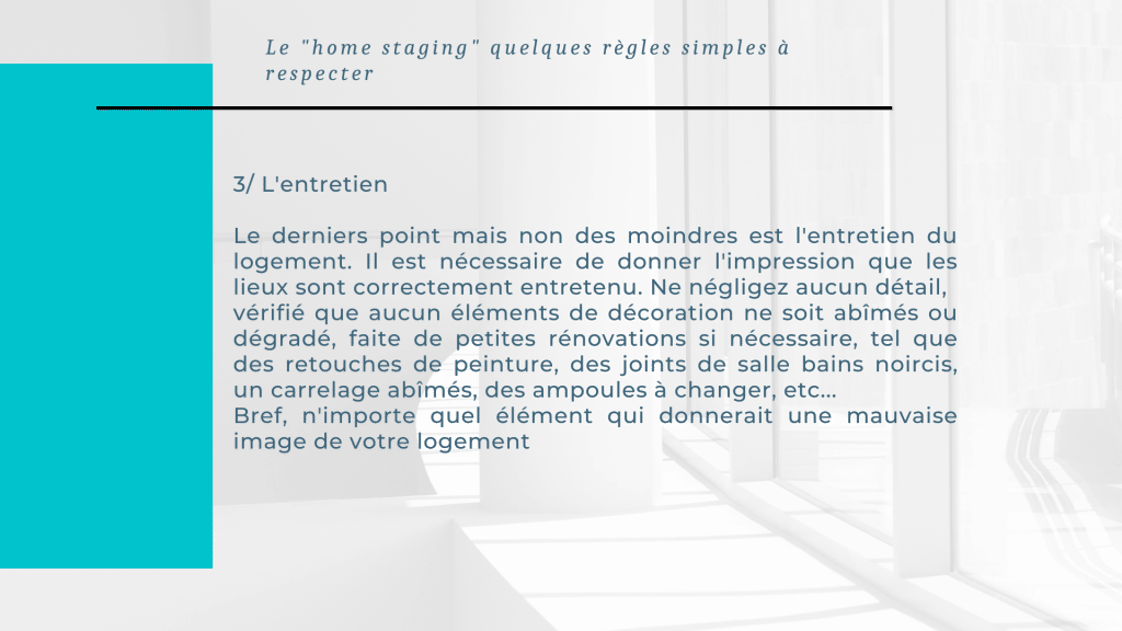 Le derniers point mais non des moindres est l’entretien du logement. Il est nécessaire de donner l’impression que les lieux sont correctement entretenu. Ne négligez aucun détails, vérifié que aucun élément de décoration ne soit abimés ou dégradé, faite de petites rénovations si nécessaire, tel que des retouches de peinture, des joints de salle de bains noircis, un carrelage abimés, des ampoules à changer, etc…