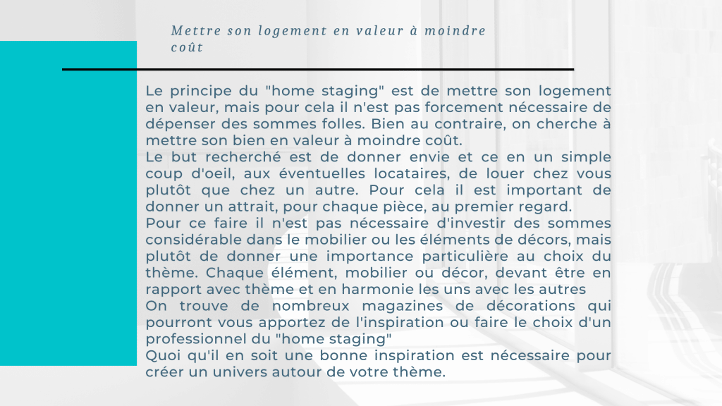 Le principe du « home staging » est de mettre son logement en valeur, mais pour cela il n’est pas forcement nécessaire de dépenser des sommes folles. Bien au contraire, on cherche à mettre son bien en valeur à moindre coût. Le but recherché est de donner envie et ce en un simple coup d’oeil, aux éventuelles locataires, de louer chez vous plutôt que chez un autre. Pour cela il est important de donner un attrait, pour chaque pièce, au premier regard. Pour ce faire il n’est pas nécessaire d’investir des sommes considérable dans le mobilier ou les éléments de décors, mais plutôt de donner une importance particulière au choix du thème. Chaque élément, mobilier ou décor, devant être en rapport avec thème et en harmonie les uns avec les autres On trouve de nombreux magazines de décorations qui pourront vous apportez de l’inspiration ou faire le choix d’un professionnel du « home staging » Quoi qu’il en soit une bonne inspiration est nécessaire pour créer un univers autour de votre thème.